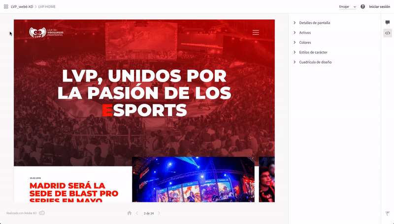 Aquesta és la manera com comprovem que amb un sol enllaç podem traspassar tot el projecte al desenvolupador, evitant enviar-li un paquet ple de carpetes amb imatges i icones difícils d’ubicar. Si el desenvolupador necessita un icona, simplement farà clic sobre ell a la pantalla i el descarregarà. Potser no és tan útil en un projecte nou, però sí en un amb petits canvis. Tot i això, això no eximeix els dissenyadors de preparar un paquet d’imatges JPG o PNG. Tot i que XD permet especificar si dissenyem en x1 o x2, o exportar recursos des del programa, l’optimització d’imatges per a descàrrega no és gaire eficient pel que fa al pes. Per tant, és recomanable preparar les imatges més grans (generalment les fullscreen) a Photoshop o amb una eina de compressió amb pèrdua mínima de qualitat. (A Adobe XD Feedback ja han proposat aquesta millora.)