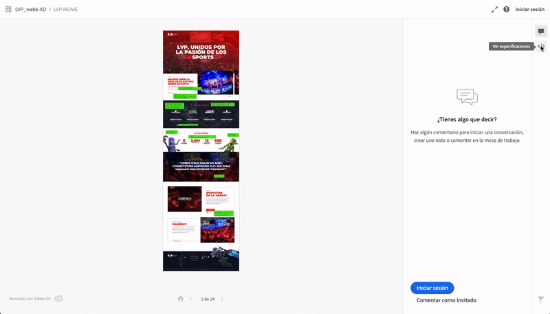 L’enllaç per a revisió, com indica el nom, ens és útil perquè el client revisi i validi la proposta de disseny. Només veurà el disseny o prototip interactiu (sense imatges descarregables ni dades innecessàries). Per tant, pot visualitzar la proposta des del navegador d’escriptori o mòbil de manera ràpida i fluida. També permet comentaris per pantalla que poden enviar-se com a convidat o creant un ID d’Adobe (fet que recomanem, ja que ens enviarà una notificació per correu quan hi hagi nous comentaris i el control del feedback serà molt més àgil i concret).