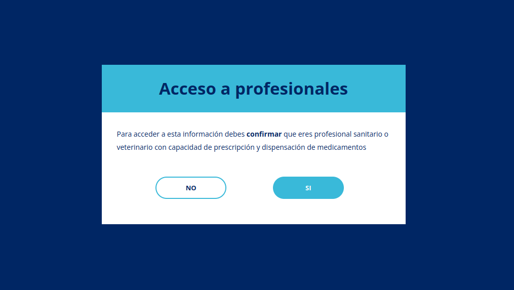 For this we show a modal that asks you if you are a professional: clicking yes hides the modal, clicking no goes to the previous page on the site if there was one or to the main page.
