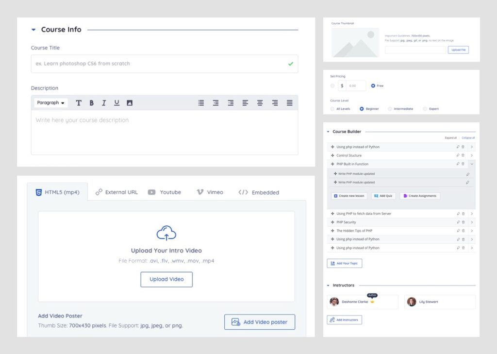 Before creating the course syllabus and the different exams or tests, these platforms allow creating an attractive card with course information. These cards are very effective for attracting potential students and are organized as a catalog in a grid that works as a showcase and with a search engine with filters, if necessary.