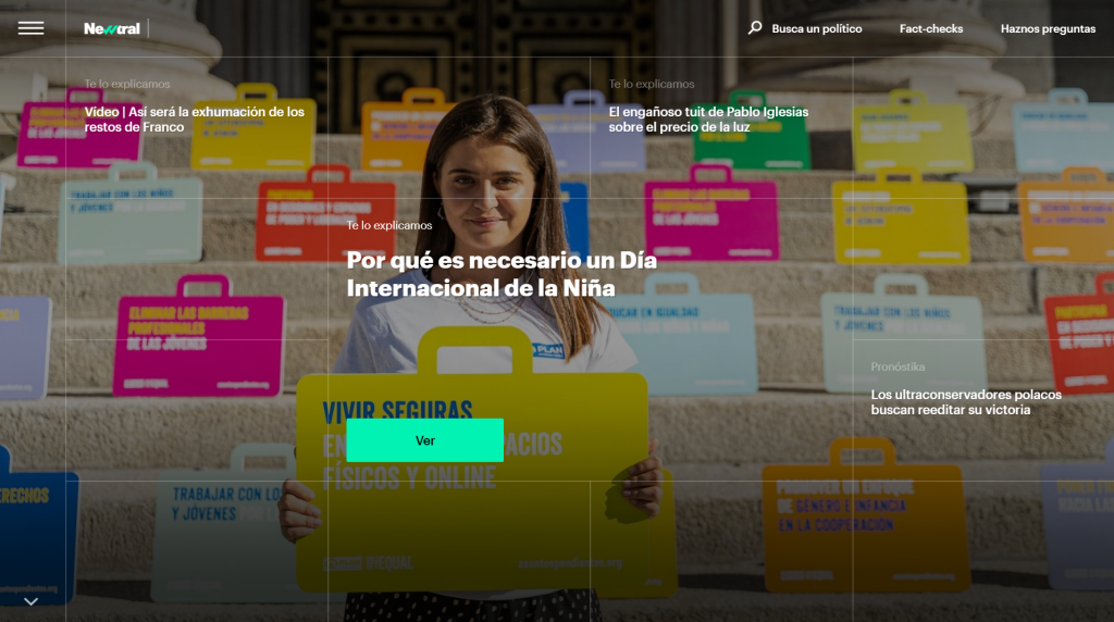 Newtral is the audiovisual content startup, by journalist Ana Pastor. A pioneering startup in investigative journalism through fact-checking (data verification) that also has its side as a television program producer, some as successful as “El Objetivo” on La Sexta television.
