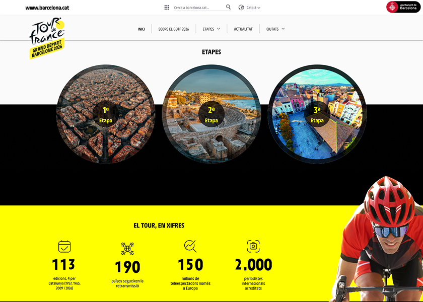 The Letour Barcelona website design is modern and visually appealing, with a color palette reflecting the identity of the Tour de France and the host city. The typography is clear and readable, facilitating navigation and content reading. The homepage features sections such as About GDTF 2026, stages, news, and cities, allowing users to easily access relevant information.