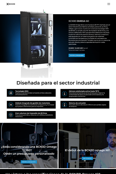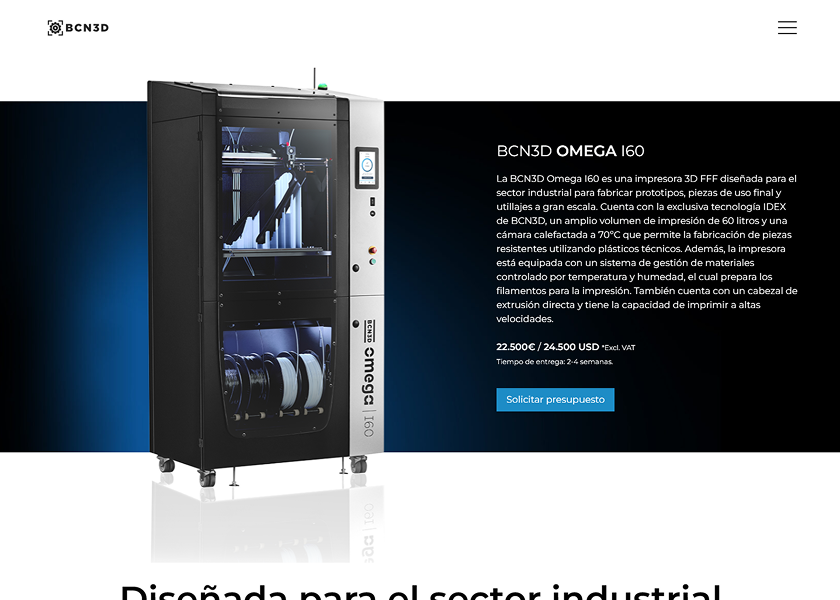 BCN3D Technologies is a company specialized in the design, manufacturing, and commercialization of professional 3D printers of the FFF (Fused Filament Fabrication) type, aimed at engineering, manufacturing, product design, education, health, and research sectors. bcn3d.com Their offerings include not only hardware (printers with independent dual extrusion IDEX technology for multi-material printing) but also filaments, software, accessories, and complete solutions for industrial and professional environments. For example, the “Omega I60” series is aimed at the factory floor, with high print volumes and an active temperature-controlled chamber. bcn3d.com The target audience includes industrial companies, research centers, universities, design studios, and professionals requiring high-level 3D printing, rather than domestic consumers. The brand conveys values of technological innovation, professional robustness, industrial performance, and support for bringing ideas to life.