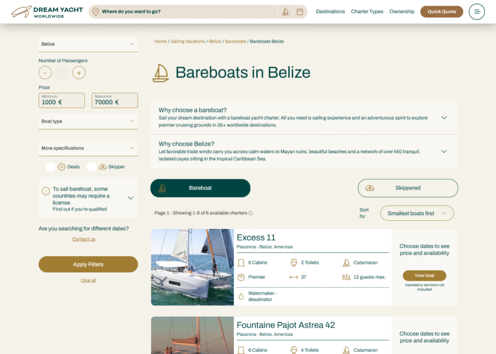 DYC, Dream Yacht Charter, is a leading company in yacht and sailing boat rentals, operating in more than 35 global destinations such as the Caribbean, the Mediterranean, and Asia. It offers bareboat charters, fully-crewed charters, cabin cruises, and shared ownership programs, catering to both experienced sailors and families, groups of friends, and companies seeking luxury experiences at sea. The company stands out for the quality of its vessels and customer service.