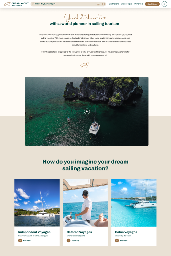 The structure is intuitive, with clear sections for destinations, charter types, offers, and contact. It includes detailed information for each destination, maps, activities, and vessel options, along with the possibility to request personalized quotes. Navigation is smooth and mobile-friendly, reinforcing the premium brand image.