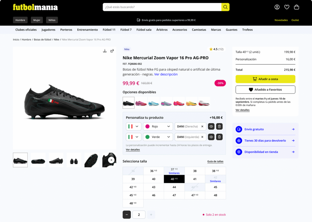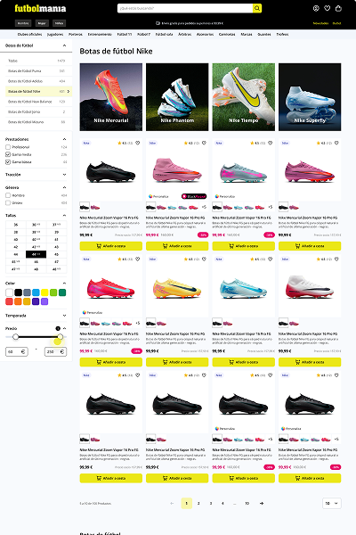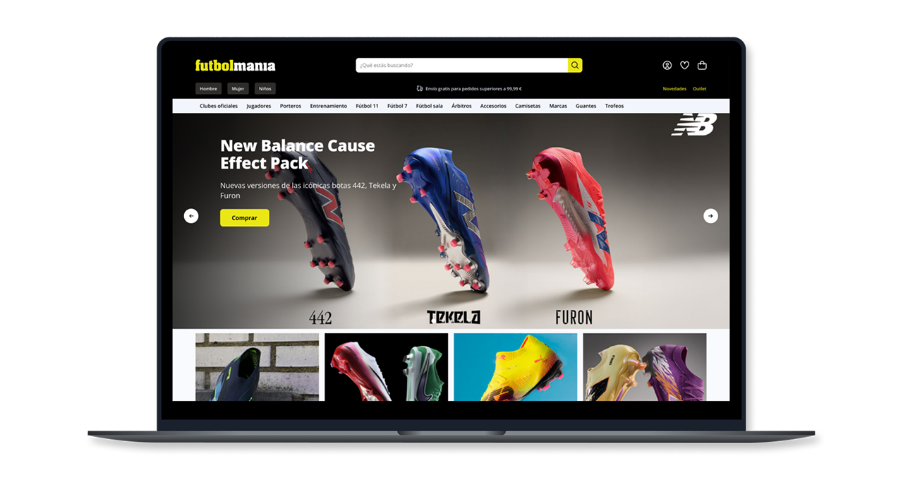 Futbolmania is a store for footwear, equipment, accessories, and clothing for football and related sports, for both adults and children. Extensive catalog, highly specific filter system (surface, range, product type, size, player), advanced user/registration/order modules, and countless adaptations for frontend, backend, and integrations.