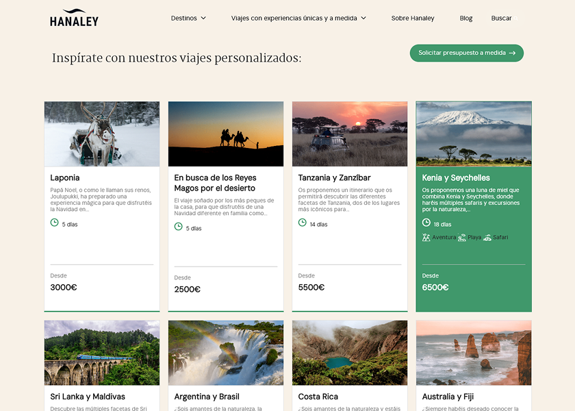 We developed the new WordPress website for Hanaley Travel, an agency specialized in tailor-made trips and exclusive experiences. The website features a carefully designed, visually attractive layout full of dynamic components such as sliders, carousels, and galleries.