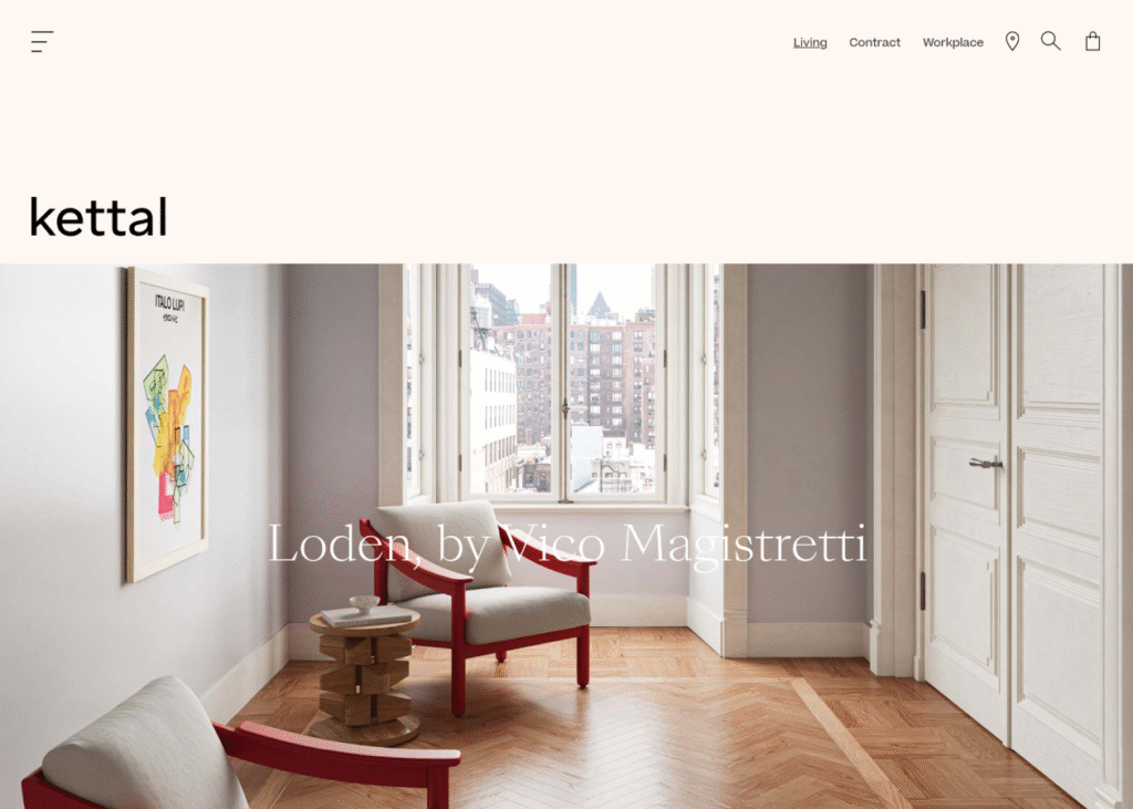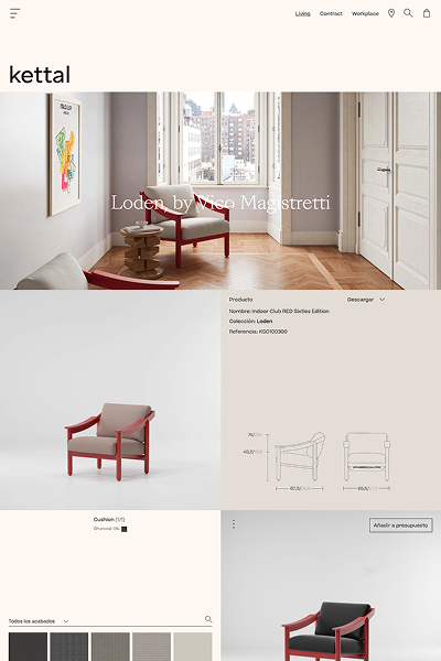 Kettal’s website stands out for its elegant and contemporary design, based on large-format images that convey exclusivity. Neutral tones such as white, grey, and natural colors dominate, enhancing the product and reinforcing a refined, luxurious aesthetic. The visual composition is clean, orderly, and heavily graphic, reflecting the identity of a sophisticated design brand.