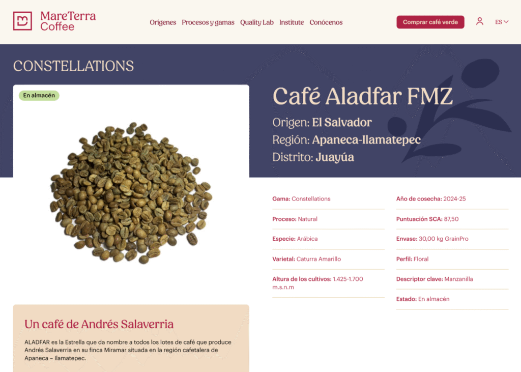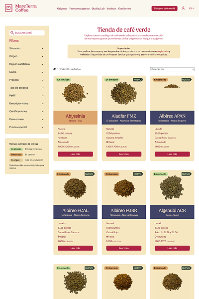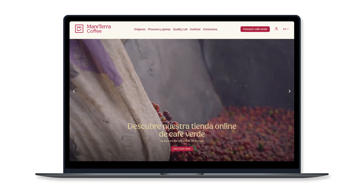 The Mare Terra Coffee website features a modern and professional design, with a color palette combining earthy and natural tones that reflect its connection to the origin of coffee. The typography is clear and easy to read, making navigation simple. The site’s structure is well organized: the homepage highlights the main product categories, origins, processes, and training, with direct links to each section. Each coffee origin includes detailed information about its provenance, flavor profile, and associated producers.