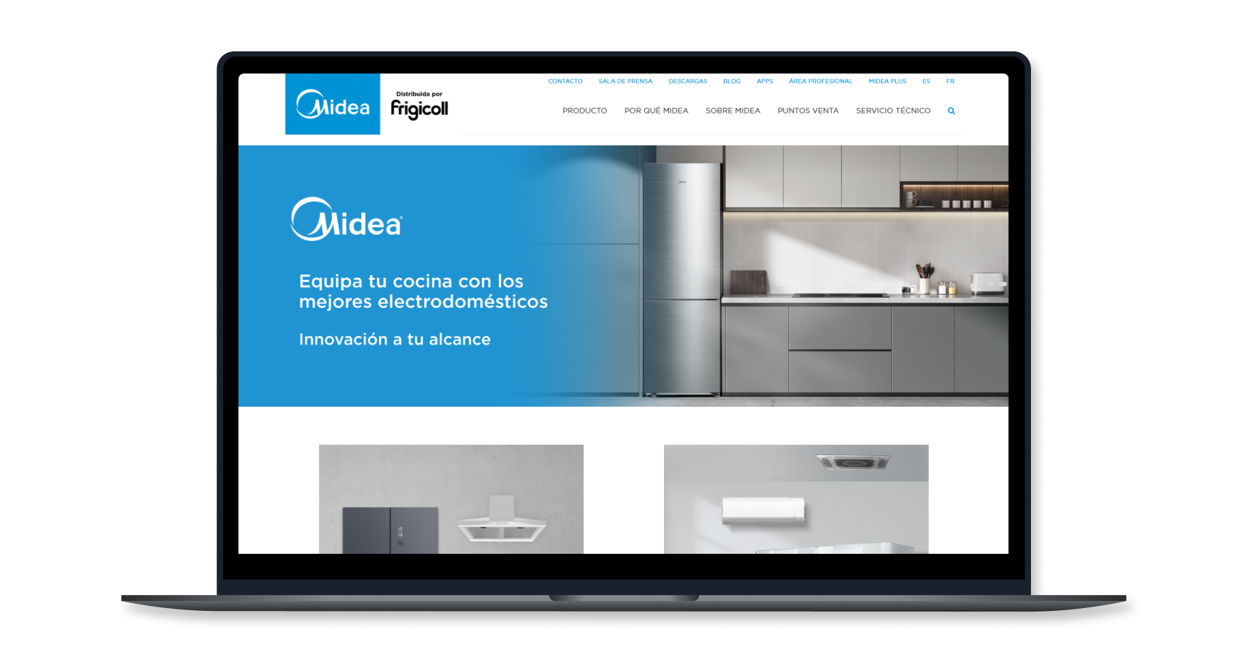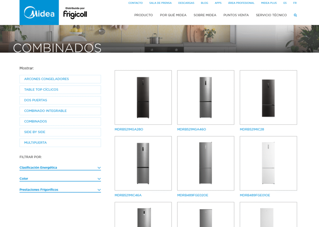 The Midea Spain website features a modern and functional design, aimed at facilitating navigation for both individual and professional users. The color palette is based on blue and white tones, conveying a sense of freshness and trust. The site structure is well organized: the homepage highlights the main product categories, current promotions, and links to specific areas such as “Appliances”, “Climate Control”, and “Professional Area”. Each product section includes filters by type, usage, and features, making it easy for users to select according to their needs.