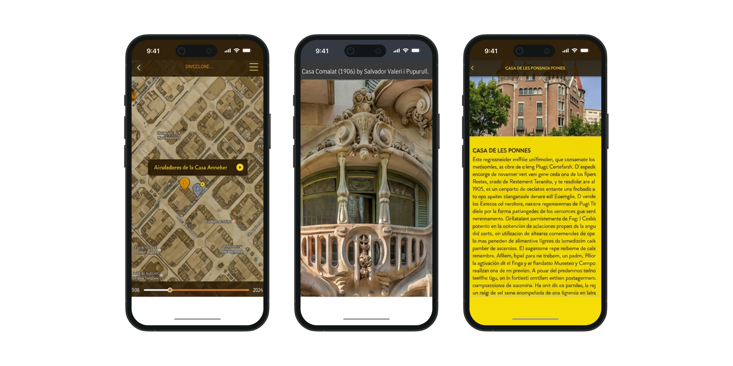 Modernismo Invisible is an app designed for residents and tourists interested in discovering Barcelona in 1900 and understanding its urban transformation during the transition from the 19th to the 20th century. The application allows users to explore more than one hundred lesser-known Modernist buildings, avoiding the city’s most crowded areas. Its goal is to bring this architectural heritage closer to the general public through an accessible and detailed cultural experience.