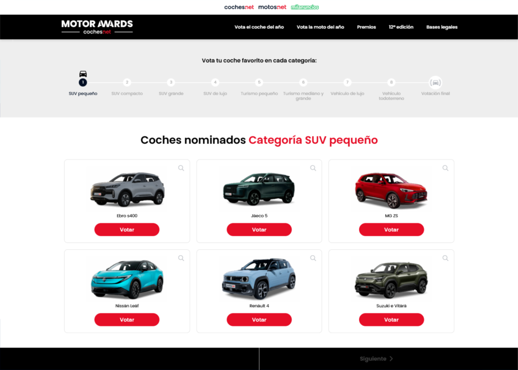 Coches.net, together with Motos.net and Milanuncios, organizes the Motor Awards, an initiative that allows the public to vote for their favorite car and motorcycle of the year. Users can choose from a series of models grouped into different categories; afterwards, the “Car of the Year” and the “Motorcycle of the Year” are selected.