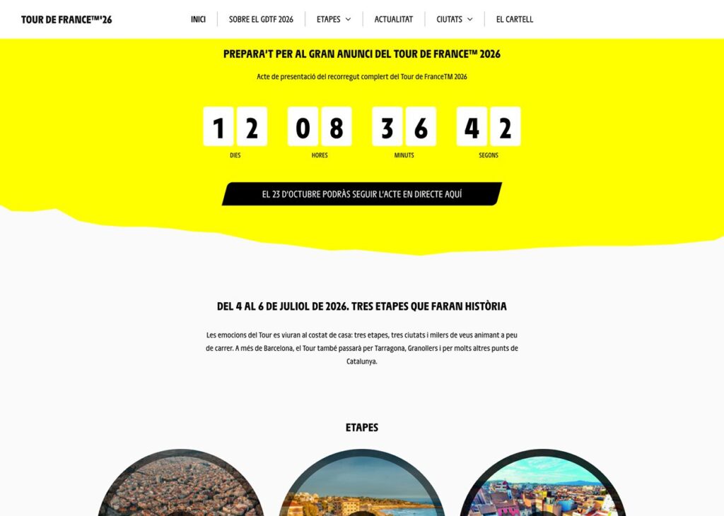 El diseño del sitio web de Letour Barcelona es moderno y visualmente atractivo, con una paleta de colores que refleja la identidad del Tour de France y la ciudad anfitriona. La tipografía es clara y legible, facilitando la navegación y la lectura del contenido. La página de inicio presenta secciones como (Sobre el GDTF 2026, etapas, actualidad y ciutats) , permitiendo a los usuarios acceder fácilmente a la información relevante.